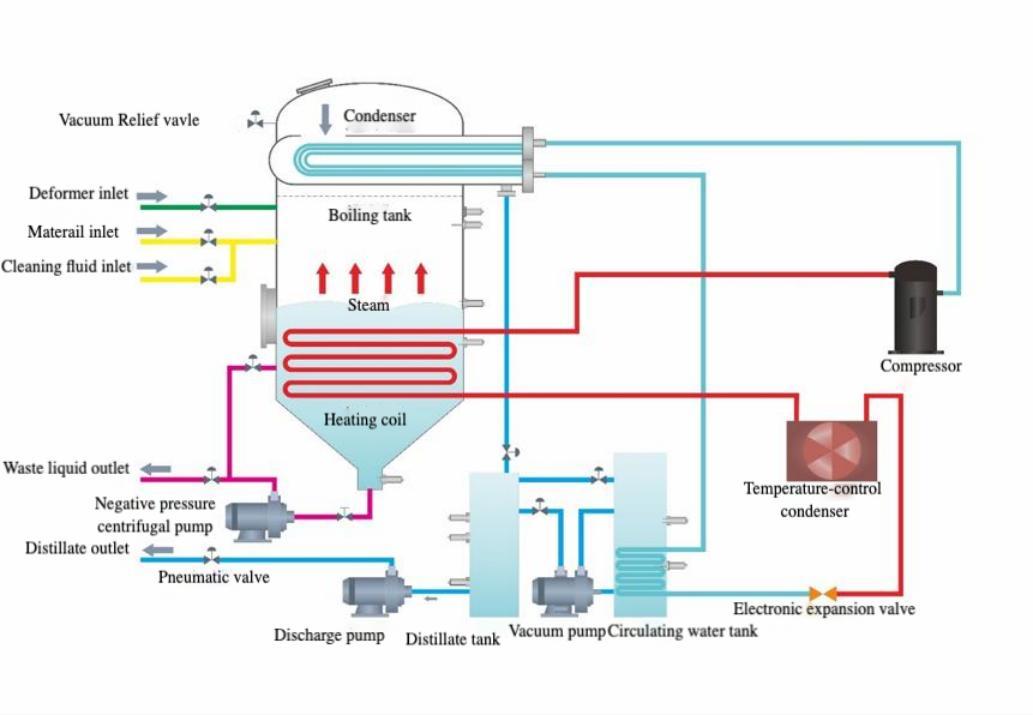 Utilizing a vapor compression heat pump cycle under vacuum conditions, it enables low-temperature evaporation with high energy efficiency and reduced operating costs.