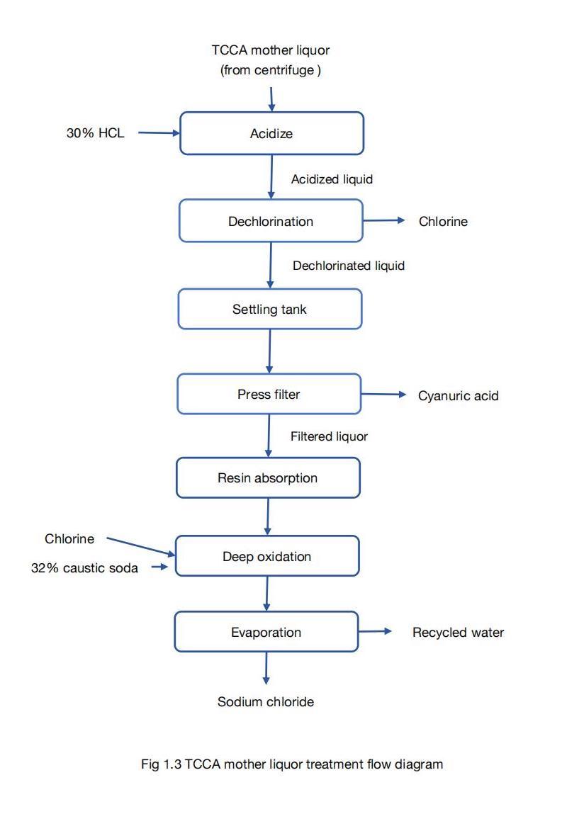 The treatment process for TCCA wastewater generally consists of four steps: acid hydrolysis, cyanuric acid recovery, resin adsorption, deep oxidation, and evaporation concentration.
